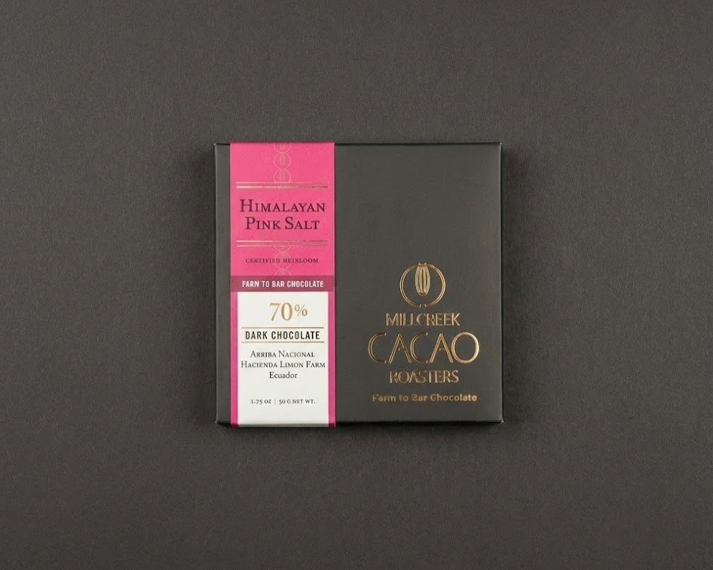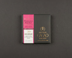 In the contrasting flavors of this dark chocolate bar, the uniquely forming crystals of the Himalayan salt add a slight crunch to the already multi-faceted experience.